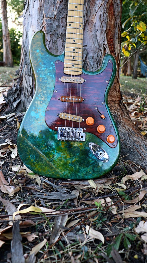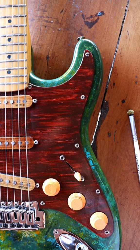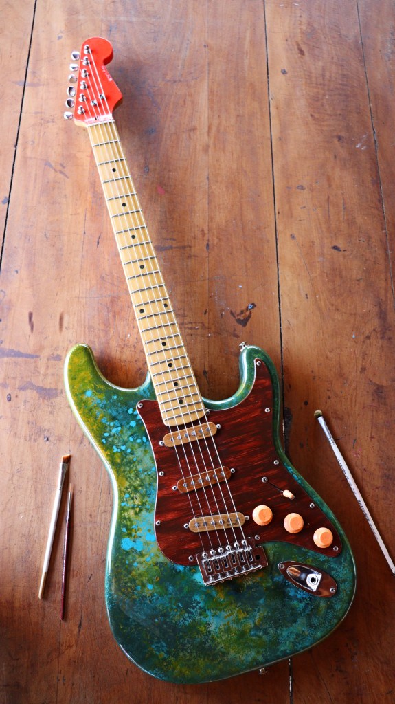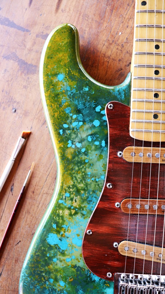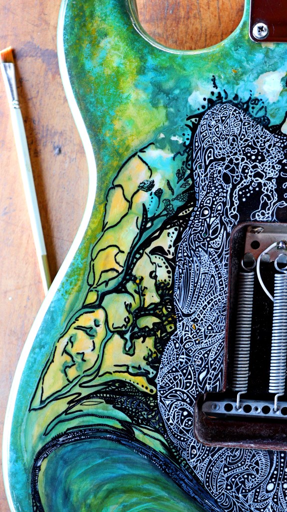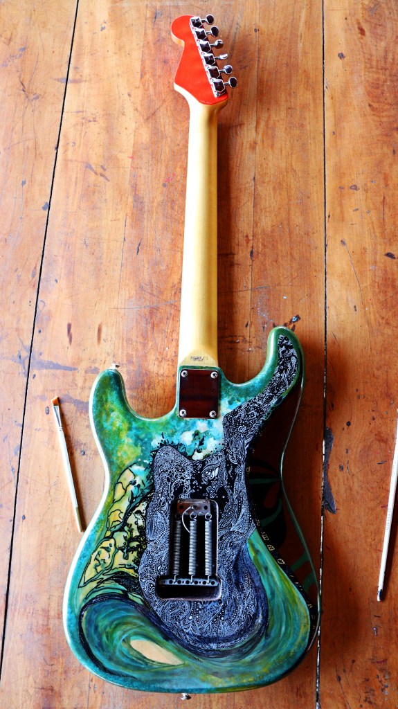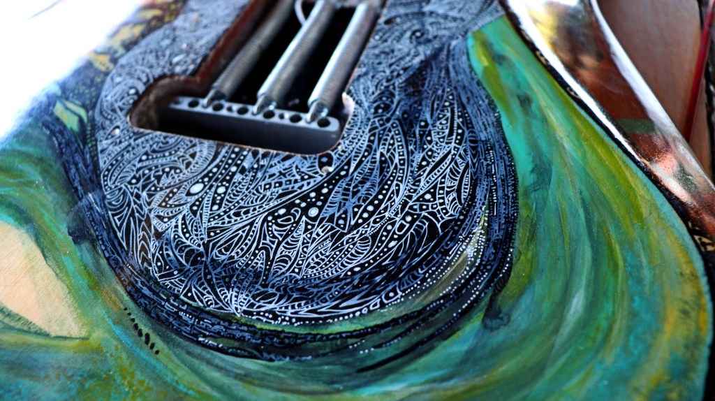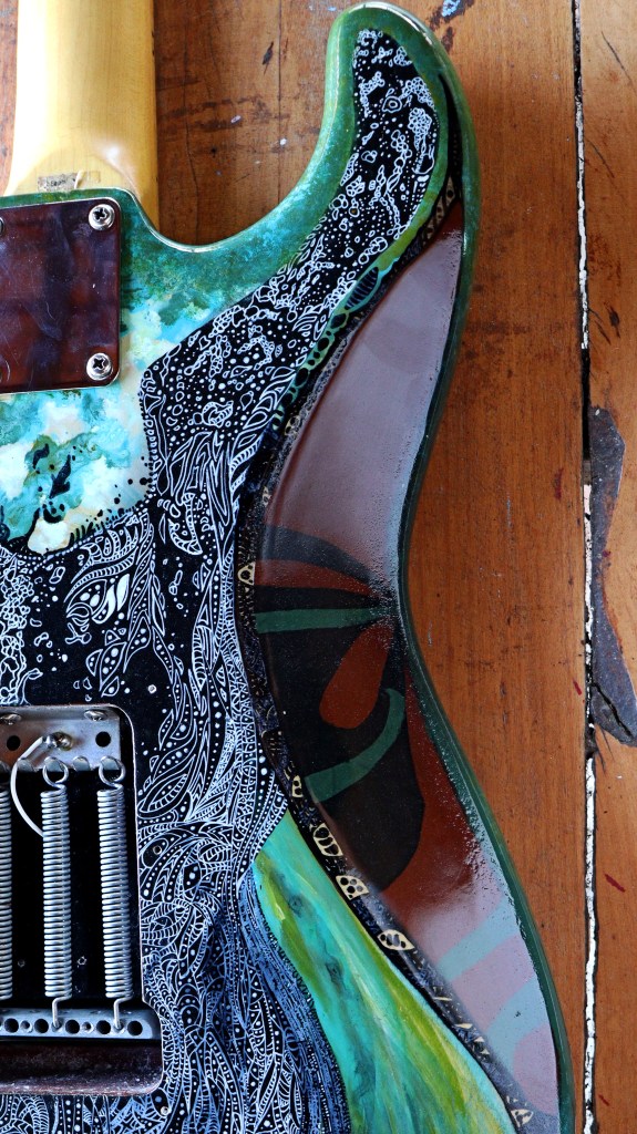 This is Gaia, the Mother-Earth. I´ve tried to make some kind of painting based on the colors of nature: about 3 or 4 different kind of green, a heavy indian yellow and a turquoise blue for some sorts of details. For the pickguard, I used a mix of brown and red to make this kind of wooden aspect. At the back of it, you got the heart of Gaia, the living part, with a lot of white drawings based on the shape of cells of living beings and leaves. I decided to leave the springs without their guard just to see the visual effect of the steel close to my organic drawings… And I really liked it.