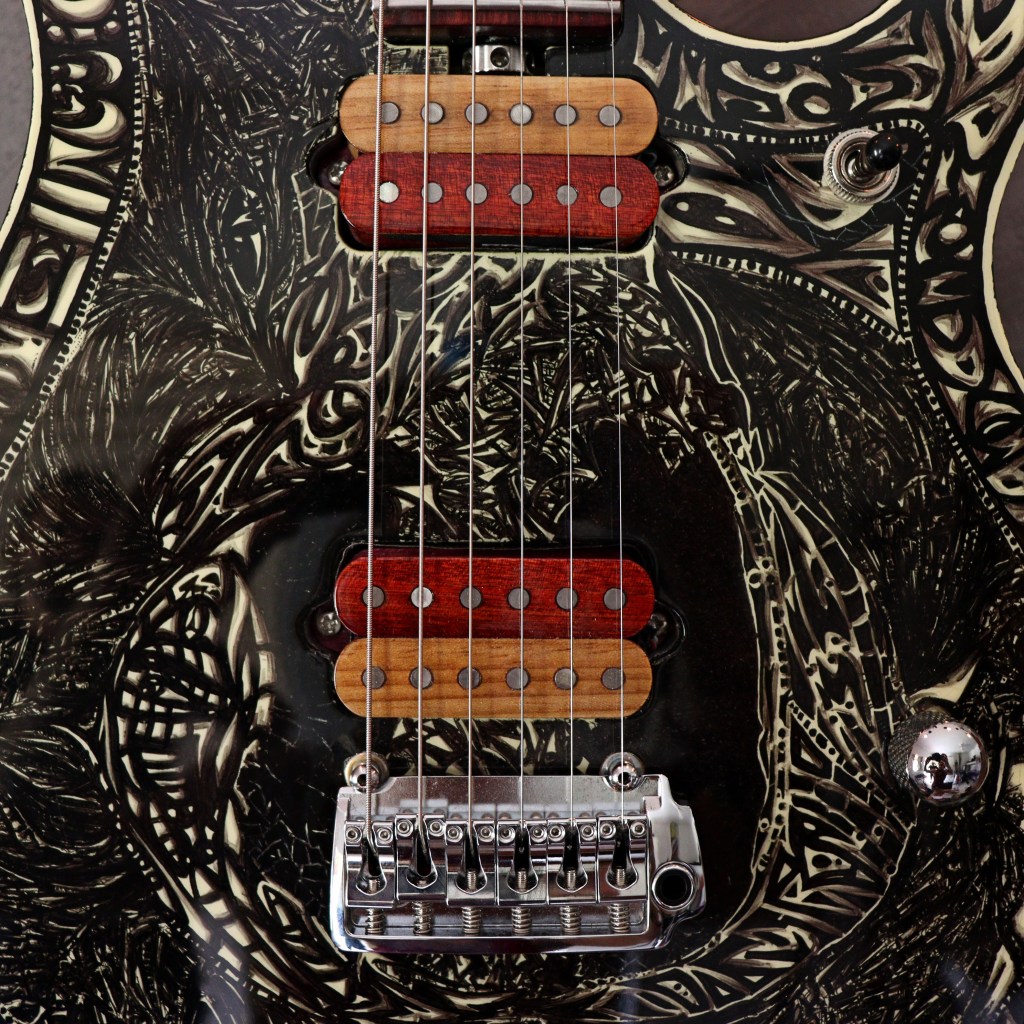 Detail of the pickups. Wooden covers made with two Brazilian special woods: Tauari (the yellow one) and Muirapiranga (the red one). This pickups were made by the Brazilian luthier Samuel Lima.